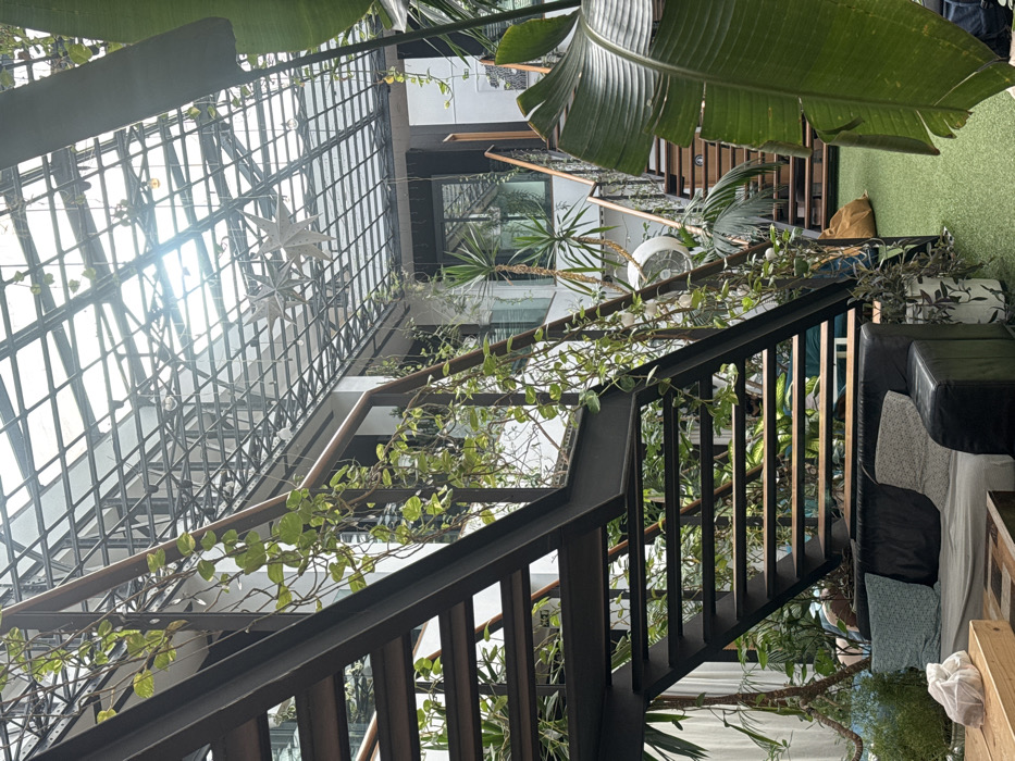 This image depicts an indoor atrium or covered courtyard, located in Lisbon, Portugal, characterized by extensive plant life and multi-level architecture. In the foreground, a dark metal industrial-style staircase with open risers and wooden treads ascends towards the upper right. Green vining plants, appearing to be Pothos or a similar species, are extensively draped over the metal frame and railing of this staircase. Beneath the lower steps of this staircase, a seating area features a dark-colored sofa, partially covered with a light fabric throw, and three patterned throw pillows (two teal, one lighter). A light wooden coffee table is positioned in front of the sofa, with a white, crinkled object, possibly a plastic bag, resting on it. The floor in this area is partially visible and appears to be a hard surface. In the midground, to the right of the primary staircase, another staircase, constructed from wood, ascends upwards, with wooden treads and railings. The floor beneath and around this area is covered in green artificial turf. Numerous potted plants of various species are distributed throughout the space, including large-leafed plants resembling banana leaves in the far right foreground, and several slender Yucca-like plants. A white circular fan is mounted on a structure or wall between the two staircases. The upper portion of the scene reveals a glass roof supported by a dark metal grid framework, allowing ample natural light to illuminate the space. A bright glare from direct sunlight is visible through the glass ceiling in the upper right. Two large, white, multi-pointed star-shaped lanterns or decorations hang from the ceiling grid, along with small, scattered light fixtures. The background features light-colored walls with dark-framed windows or doorways reflecting parts of the interior. A brown beanbag chair is visible on the artificial turf to the right of the main staircase. No clearly identifiable individuals are present in the scene, though a highly obscured, dark form is vaguely visible behind the lower steps of the left staircase.