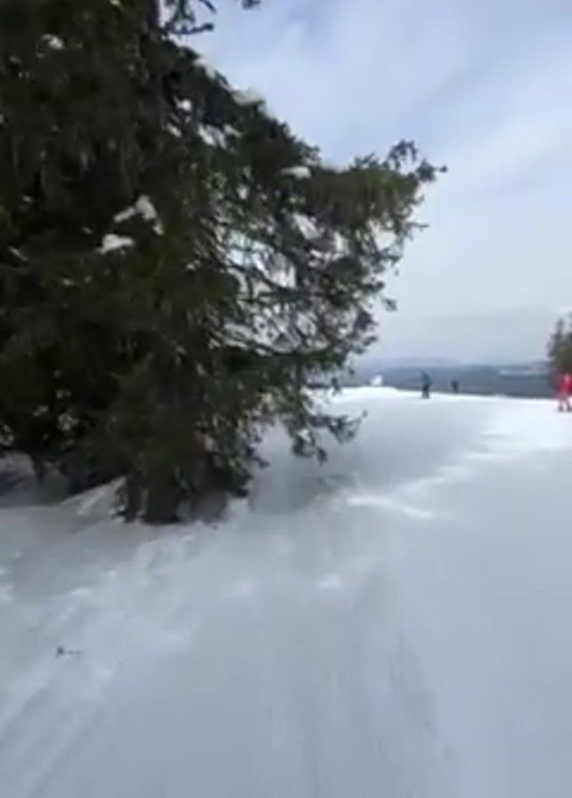 snowy ski slope, presumably during the day, as it is well lit. The camera moves down the slope, showing several skiers in various colored outfits spread out. Tall evergreen trees line the side of the slope, some with snow on their branches. The sky is overcast with some patches of blue. The snow on the slope appears well-groomed. There is a visible horizon line in the distance.