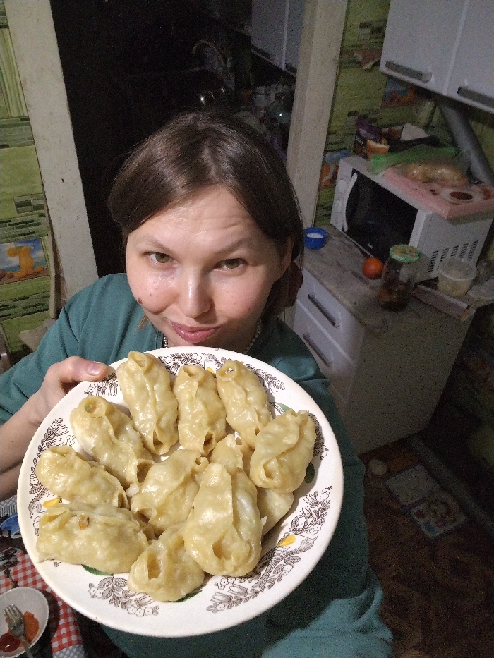 - "A woman with brown hair, wearing a teal-green long-sleeved top, holds a white plate filled with approximately twelve steamed dumplings (manti or similar) towards the viewer" by FM-ETxTW2, licensed under CC BY 4.0