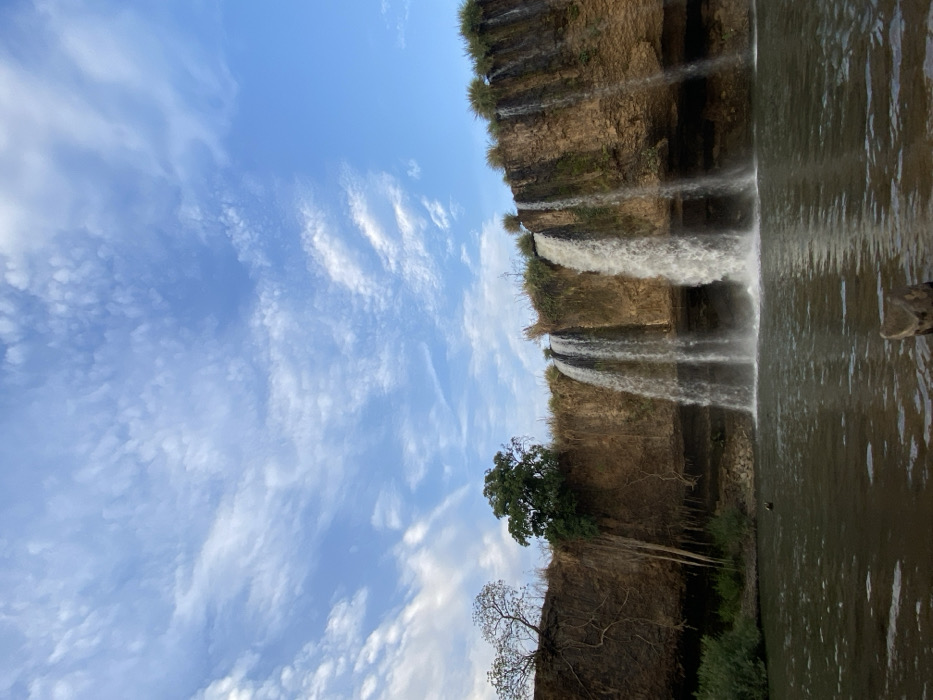 A waterfall cascades down a rugged cliff face into a murky pool. Vegetation clings to the cliff's edge, with sparse trees below. The sky, a bright blue canvas, is adorned with wispy white clouds. The image is oriented sideways, presenting a unique perspective of the natural scene. The waterfall is the main focus.