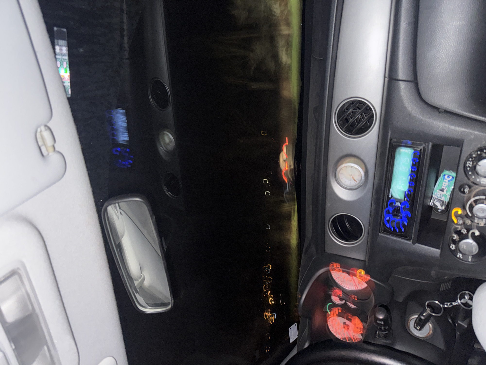 interior of a car at night. The dashboard is visible, along with the steering wheel and a rearview mirror. Outside the window, there are lights indicating a city or a road. No people are visible. The location is unknown, the prompt is incorrect.