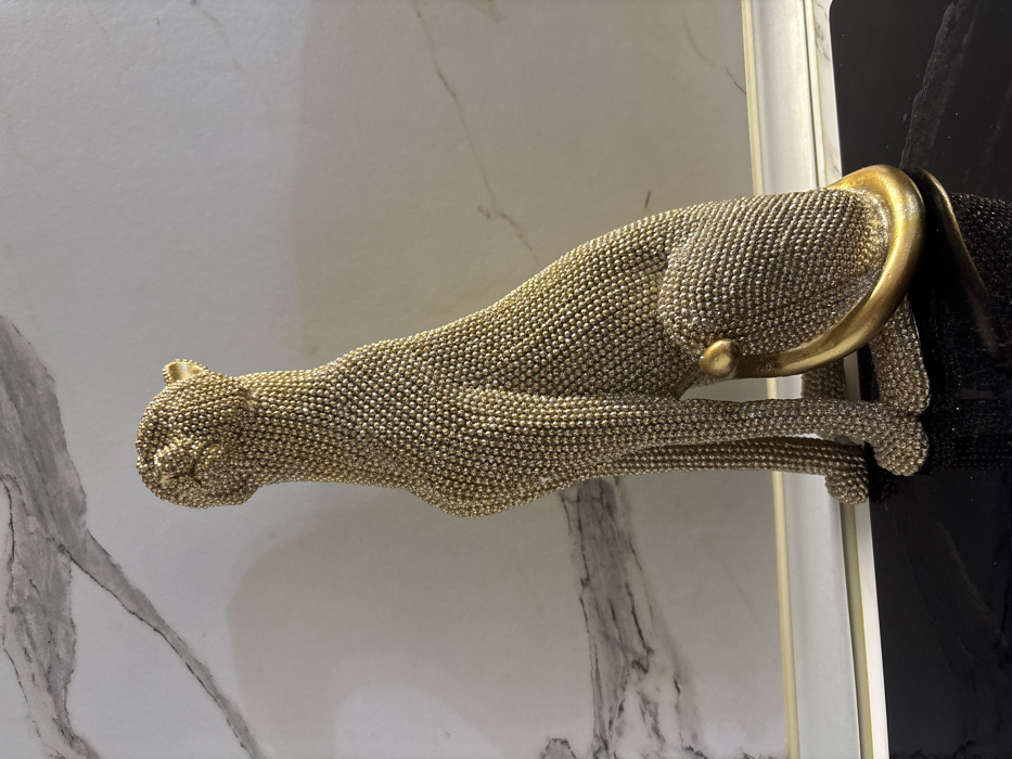 A golden, beaded statue of a seated feline, resembling a cheetah or leopard, is positioned on a highly reflective, dark surface, likely polished black stone
