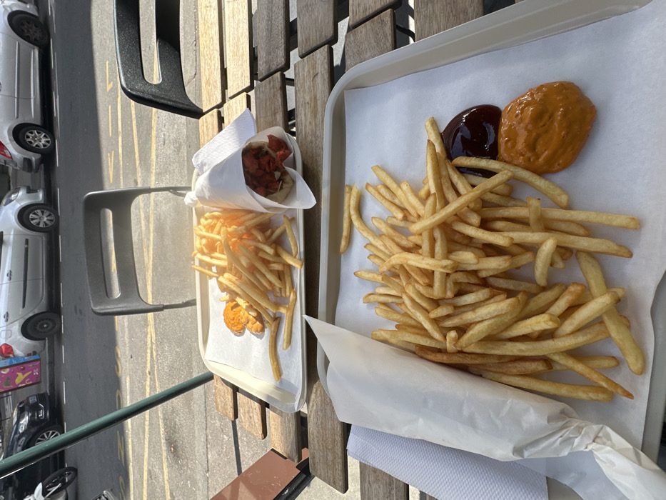 The image depicts an outdoor dining scene in Clichy, France. Two light-colored trays, each lined with white paper, are placed on a slatted wooden table. The tray in the foreground contains a substantial portion of golden-brown french fries, accompanied by two distinct sauces: a dark red, likely ketchup, and an orange-yellow sauce, possibly sauce algérienne. To the left of this tray, a folded white paper napkin is visible. The tray in the background also holds a large serving of french fries, alongside what appears to be a wrapped sandwich or "tacos français" containing red-colored meat, partially enclosed in white paper. Adjacent to the fries on the back tray, a few irregularly shaped, fried items, possibly chicken nuggets or pieces, are visible. Two dark, lightweight outdoor chairs are positioned at the table. In the background, a sunlit street is visible, with yellow lane markings. Several parked vehicles, including silver hatchbacks, a dark sedan, and a white scooter, line the curb. A green metal pole, possibly from a cafe awning, is on the left edge. No individuals are present in the frame.