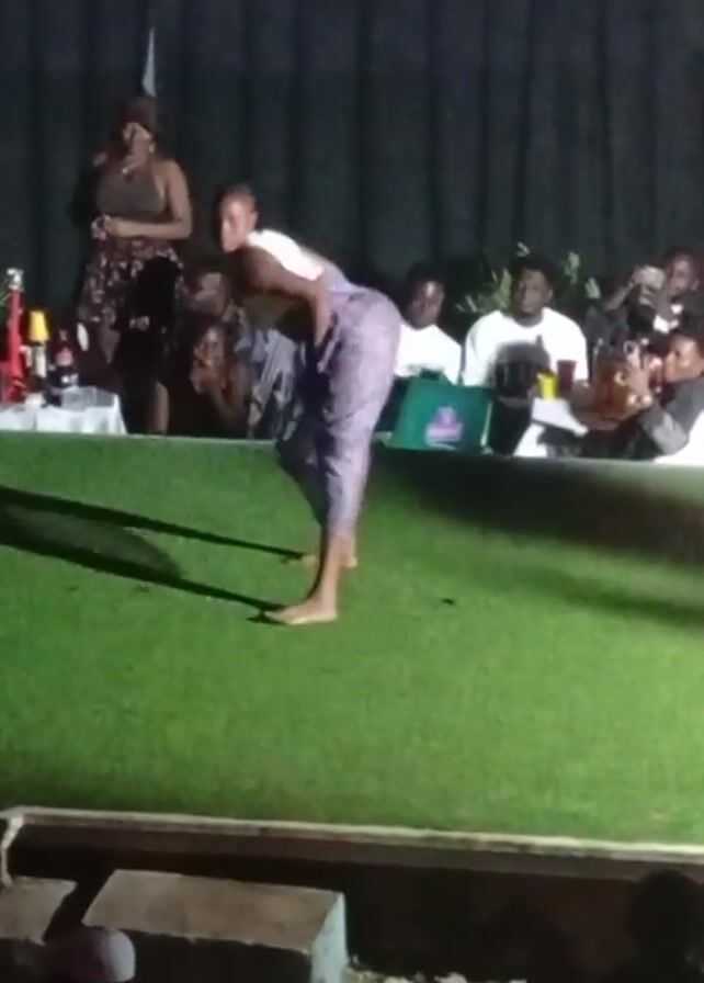 The video depicts a barefoot, light-skinned woman with a shaved head, wearing a white tank top and a long, lavender-colored skirt. She is performing a dance on a small patch of artificial green turf, bending low with her back arched. Behind her, several people are seated at a table, including a woman in a floral dress and other men in various casual attire. Some people at the table are recording the dance with their phones, and bottles of alcohol are visible. The background is a dark curtain, and the video is shot from a low angle.