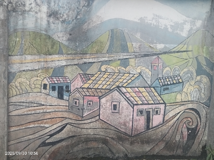 - "This image displays a weathered outdoor mural painted on a textured wall, depicting a stylized village landscape in Kasioni, Kenya" by FM-OUP0C3, licensed under CC BY 4.0