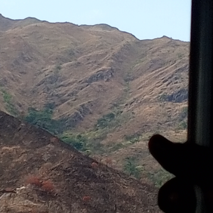 A mountainous landscape under a pale sky dominates the scene. Brown and tan hues cover the slopes, punctuated by patches of green vegetation. Lower down, the ground appears darker, possibly burned. A finger and part of a window frame are visible in the foreground, partially obscuring the view. The overall impression is one of a rugged, possibly arid, environment.