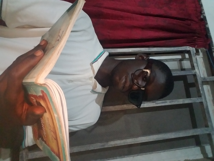A person wearing sunglasses lies on a metal bed frame under a red curtain. They are reading a book held up in their left hand. The book is open, revealing illustrated pages. The person wears a white collared shirt. The background is a combination of the bed frame and a plain wall. The scene suggests a casual, indoor setting, perhaps a moment of relaxation.
