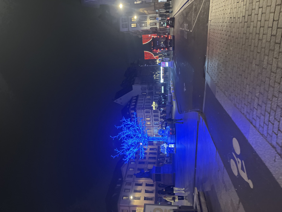 - "A nighttime view of a European city street decorated for the holidays" by FM-xCFLT2, licensed under CC BY 4.0