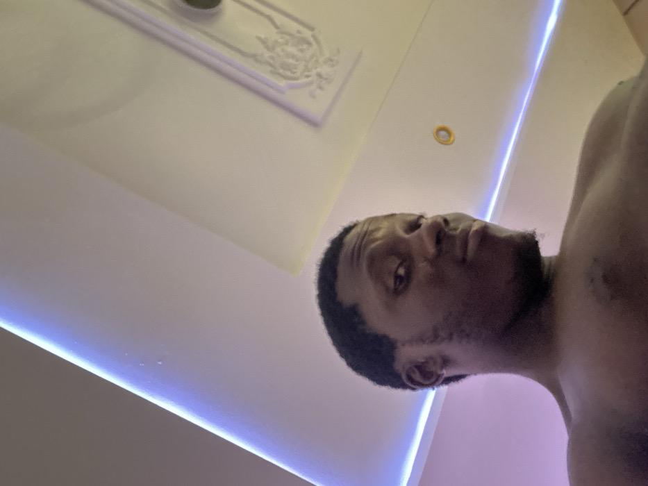 A low-angle, tilted shot focuses on an adult man's head and upper torso. His dark hair is neatly trimmed, and he gazes slightly upwards with a serious expression. His skin tone is brown, and light stubble is visible on his face. The man's bare shoulder is visible in the lower right corner. The background features a white ceiling with decorative molding and embedded lights that create a blue glow. An access panel or vent is also present in the ceiling.