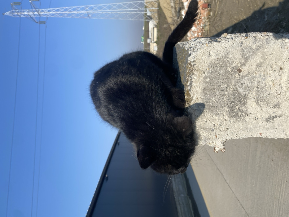 This image depicts a scene in Palilula Urban Municipality, Serbia. A black cat is positioned on top of a weathered, light gray concrete block, with its head lowered and facing downwards towards the immediate foreground. The cat's tail extends behind it, resting on the block. To the left in the background, a large, dark-colored building with a sloped roof is visible, alongside a concrete ground surface. In the background to the right, a tall metallic lattice transmission tower stands against a clear, bright blue sky, with overhead power lines visible. The distant ground on the right shows uneven terrain with scattered debris and sparse vegetation. Strong sunlight illuminates the scene, creating distinct shadows.