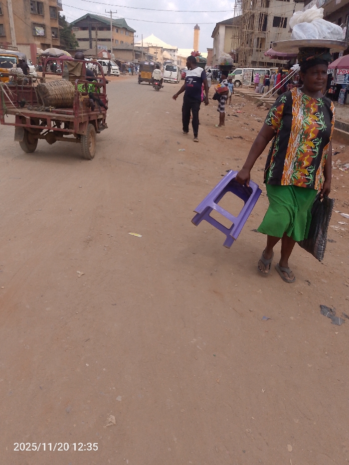 The image depicts a bustling street scene in Nnewi, Nigeria, at approximately 12:35 PM on November 20, 2025. The foreground shows an unpaved, reddish-brown dirt road with scattered debris. A woman, positioned in the right half of the frame and walking towards the right, is the primary subject. She wears a black, short-sleeved top with green, orange, and yellow patterns, a solid green skirt, and grey sandals. She carries a purple plastic stool in her right hand, a black bag in her left hand, and balances a large, round, silver-colored tray containing white, plastic-wrapped items on her head. In the midground, on the left side of the road, a dark red three-wheeled cargo vehicle, laden with a large wicker basket and other bundles, is partially visible. Two individuals are seated on or near the cargo bed. Further down the road, a man in a black and white striped shirt and black pants walks away from the viewer. Other pedestrians and vehicles, including a yellow motorbike and white vans/buses, are present, indicating active traffic and pedestrian movement. The background features multi-story buildings lining both sides of the street. On the right, a building is under construction with visible scaffolding. On the left, a tall, slender, light-colored structure resembling a minaret is visible in the distance, adjacent to a white, dome-like or conical building. Overhead utility lines and poles are also present. The sky is overcast or hazy, indicating daytime conditions.