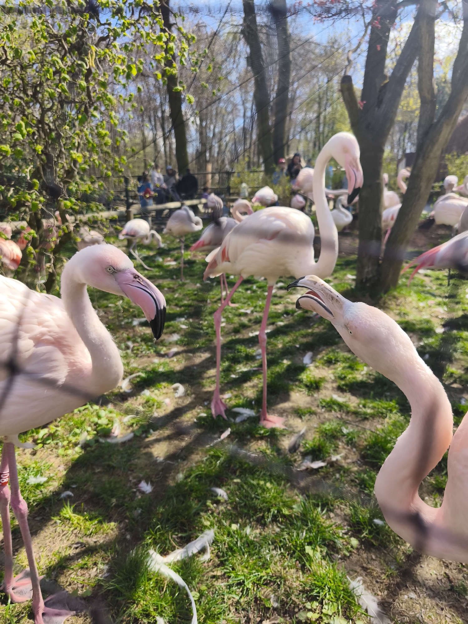 The image captures a flock of pink flamingos in what appears to be an enclosure at the Krakow Zoo, located in Krakow, Poland. In the foreground, three flamingos are prominently featured. One flamingo is partially visible on the left, another stands tall with its head upright in the center, and the third one bends its neck sharply with its beak open on the right. The ground is covered in green grass with scattered white feathers. Behind these flamingos, other flamingos are visible, some resting and others standing. In the background, a group of people can be seen sitting on a bench or ledge. Trees surround the enclosure, some with green foliage and others bare, suggesting it might be springtime. The image appears to have been taken through a barrier, possibly glass or wire.