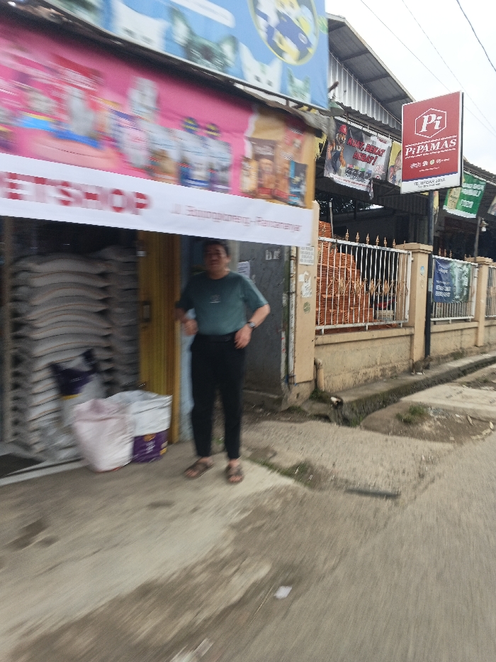 The image displays a street scene in Cangkuang Kulon, Indonesia, showing the exterior of a commercial establishment and its surroundings. On the left, a "PETSHOP" is visible, featuring a large pink banner above its entrance displaying various pet food products. Above the pink banner, a blue banner with cartoon animal illustrations (cats and dogs) is present. A white banner with red text reading "PETSHOP" and "Jl. Sampoengkesang-Parampanya" is stretched across the top of the entrance. An adult male stands within the pet shop's entrance area. He is wearing a teal short-sleeved shirt, dark trousers, and brown sandals, and is positioned facing generally forward, slightly angled towards the right. Behind him, a closed yellow roll-up door is visible. To the left of the man, inside the shop, several stacks of white bags are piled. On the ground outside the shop, two more white bags, one with purple branding, rest near the entrance. To the right of the pet shop, a property boundary is marked by a beige concrete wall topped with white metal fencing. Behind this fence, reddish-brown construction materials (likely bricks or tiles) are stacked, and a building with a corrugated metal roof is visible. A prominent red vertical sign with the logo "Pi PAMAS" and text "Jl. IKDAR JAYA - CANGKUANG KULON" is affixed to a pole on the right side of the frame, confirming the location. The foreground consists of a grey concrete sidewalk, showing signs of wear and moisture. A narrow concrete gutter runs along the edge of the sidewalk, parallel to the fence line on the right. The sky overhead appears overcast. The image exhibits motion blur.
