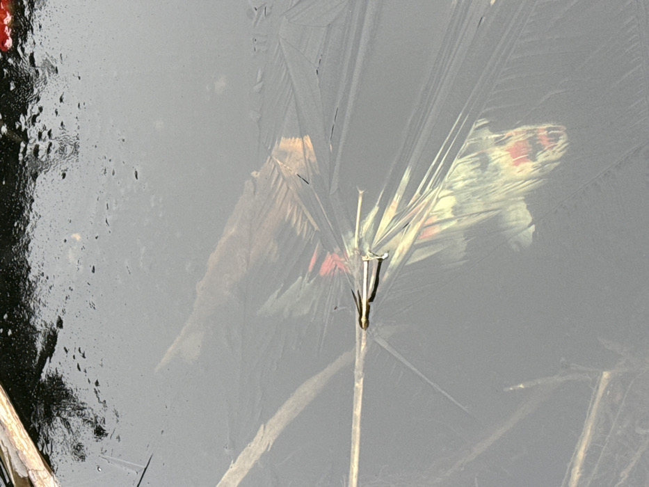 The image displays a close-up view of a partially frozen body of water in Grevenmacher, Luxembourg. The surface is predominantly covered by a dark, reflective layer of ice, exhibiting intricate linear and feathery crystalline patterns. The upper-left quadrant of the frame shows a section of dark liquid water with surface ripples and scattered small dark particulate matter. Two slender, brown-grey plant stalks, consistent with dried reeds or sticks, are partially embedded within or resting on the ice. One stalk extends horizontally from the left-center towards the mid-right. Near the center of the frame, attached to or impaled on this horizontal stalk, are two small, metallic, bent objects, resembling staples or pins, oriented perpendicularly to the stalk. Within the ice and reflected on its surface are vibrant, diffuse patterns of red, orange, yellow, and white light. These patterns are particularly concentrated in the lower-central area, where they coalesce into an abstract, skull-like or grotesque face-like configuration, featuring distinct red markings suggestive of eyes and a jagged mouth, set against lighter, yellowish-white contours. Faint reflections of an overcast sky are visible in the upper portions of the ice. No individuals or overt actions are depicted.