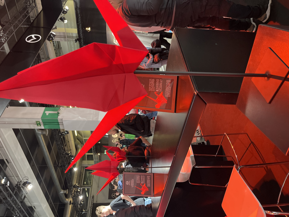 This image depicts an indoor exhibition hall, specifically identified as Messe Zürich in Zurich, Switzerland, likely during an automotive or technology trade show. The central focus is a promotional display featuring multiple large, stylized red origami crane sculptures. One crane, partially cropped, stands prominently in the immediate foreground, mounted on a metal pole from a black base. Additional red cranes are positioned further back on sleek, black, angular display tables. These tables also feature framed informational plaques with German text and red graphic silhouettes. White bar stools with chrome legs are situated under the display tables. The floor is covered in a red material, creating a strong red ambient lighting effect throughout the lower portion of the scene. Numerous individuals are present, casually dressed, standing and observing the exhibits. One person in the midground is seen wearing a red horned headpiece. The background includes a large concrete pillar marked with a green "1" and an exit arrow, a high industrial ceiling with exposed ducts and track lighting, and a prominent black Mazda logo on a dark panel. Another circular logo, consistent with Mercedes-Benz, is partially visible further in the background.