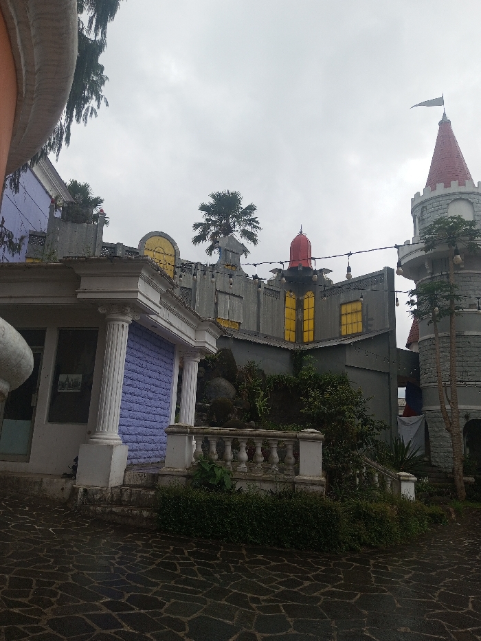 The image depicts an outdoor architectural complex in Nuwara Eliya, Sri Lanka, under an overcast sky. The foreground features a dark, irregularly patterned paved surface. To the left, a light-colored building displays two white fluted classical columns supporting an entablature. Behind these columns, a purple corrugated roll-down security shutter is visible, along with a partially obscured glass door to the left. A curved, light-colored object is partially visible in the extreme upper-left corner. In the midground, a white balustrade with multiple balusters and a handrail runs horizontally, with steps descending to the paved area. A dense green hedge or shrubbery line borders the base of the balustrade. Behind this, a multi-level building complex with gray walls exhibits a themed, castle-like aesthetic, incorporating crenellated parapets and prominent yellow-paned windows, including rectangular and semi-circular shapes. A red conical dome or roof element is situated atop a section of these gray structures. String lights are strung horizontally across the scene between buildings. To the right, a distinct gray castle tower with a red conical roof and a small white flag flying from its peak is prominent. A slender tree with sparse foliage stands adjacent to the tower. Several palm-like trees are visible above the rooftops and against the horizon. The sky is uniformly light gray and overcast. No individuals are visible in the scene.