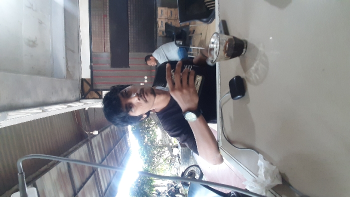A person wearing a black shirt and a wristwatch is seated at a table next to a glass of dark liquid and a black object, possibly a computer mouse. Another person in a light-colored shirt is in the background. The foreground shows a metal railing or pipe, and outside the building, there's a glimpse of trees and a vehicle wheel. The environment suggests an outdoor seating area of a cafe or restaurant.