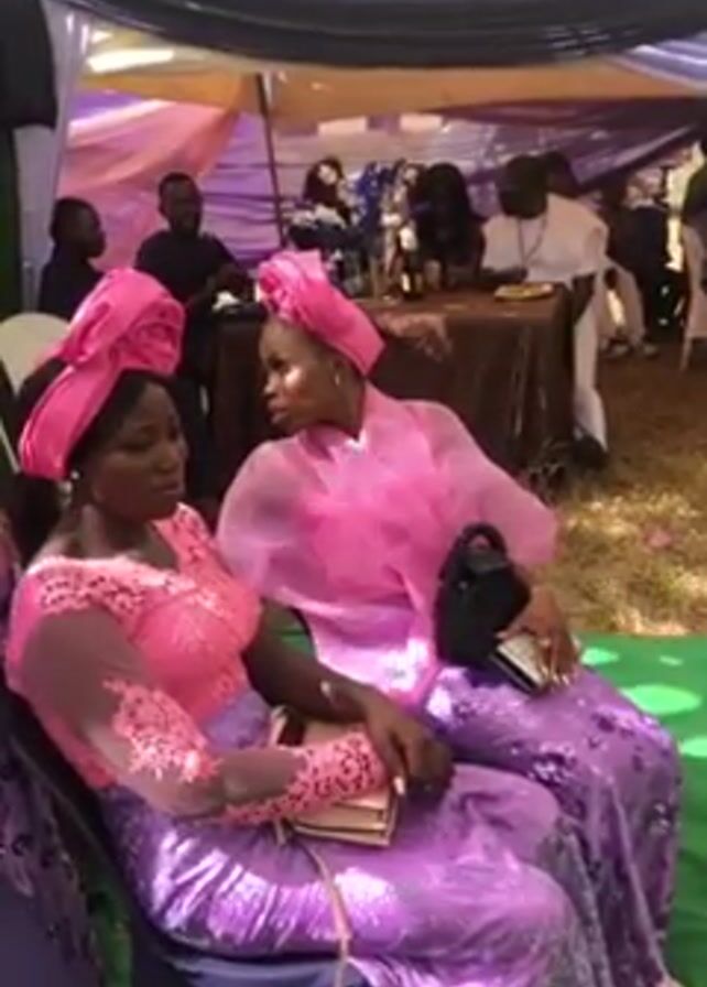 Underneath a large, partially draped tent structure, several people are seen at an outdoor gathering. The focal point is a group of three women seated in chairs. They are all wearing matching outfits with a color scheme of light pink and light purple, including head wraps. They appear to be engaged in conversation. A woman in the background wearing a black shirt with the sleeves rolled up stands at a table, while others mill around in the background. The tent structure has black and clear plastic draping. Underneath the chairs is a green carpet or grass covering. The overall scene appears to be at a formal event taking place outdoors.