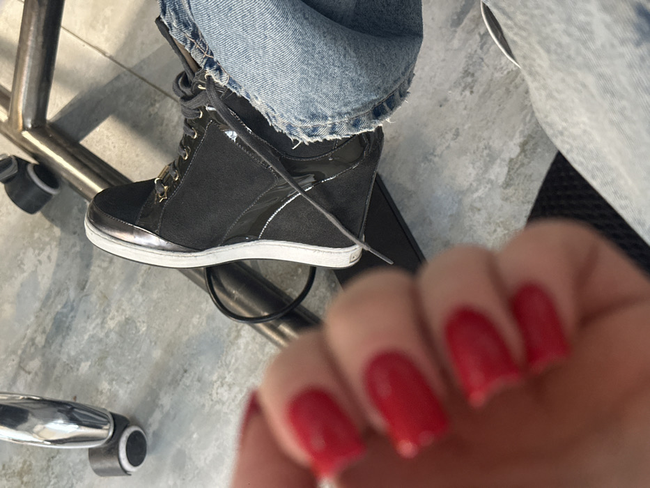 The image presents a close-up perspective of an individual's lower left leg and foot, along with a portion of their left hand. In the blurred foreground, the hand displays uniformly applied glossy red nail polish on the visible fingernails. The left foot wears a black high-top sneaker, featuring a white sole, grey laces, gold-colored eyelets, and contrasting matte and patent-like black material sections. The leg is covered by light blue, distressed denim jeans with visible tearing at the lower hem. The foot rests on a flat, dark rectangular object. The background consists of a light grey, mottled floor surface. Portions of metallic furniture are visible: a chrome-plated chair leg with black casters in the upper left, and a dark metallic support bar with a black cable or strap looped around it. No visual identifiers within the image confirm a specific location in Yerevan, Armenia.