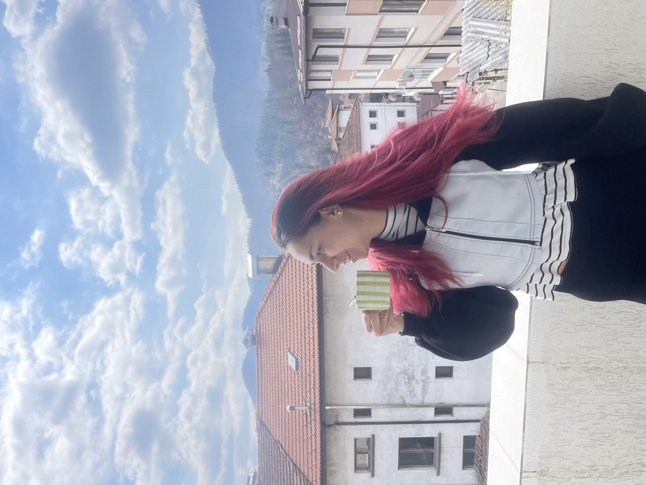 The image captures a young adult female standing on a balcony in the city of Smolyan, Bulgaria, facing towards the right in profile