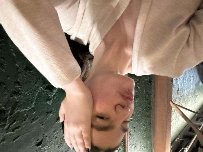 - "A woman in a beige sweater is positioned with her face nearly upside down, obscuring part of her face with her hand" by FM-x2WmZ2, licensed under CC BY 4.0