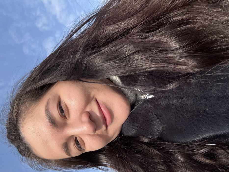 An adult female is depicted in a close-up, upward-angled outdoor portrait. She has long, dark brown hair, dark brown eyes, and fair skin, with a faint smile. She is wearing a dark, possibly black or very dark grey, fuzzy or faux fur zippered jacket. A light grey, possibly knitted, garment is visible underneath the jacket's collar. The zipper pull features a small, metallic, human-like figure. The background consists of a clear blue sky with scattered white, wispy clouds. The scene is illuminated by natural sunlight, casting subtle shadows on her face. The image is situated in the city of Kurovskoye, Russia.