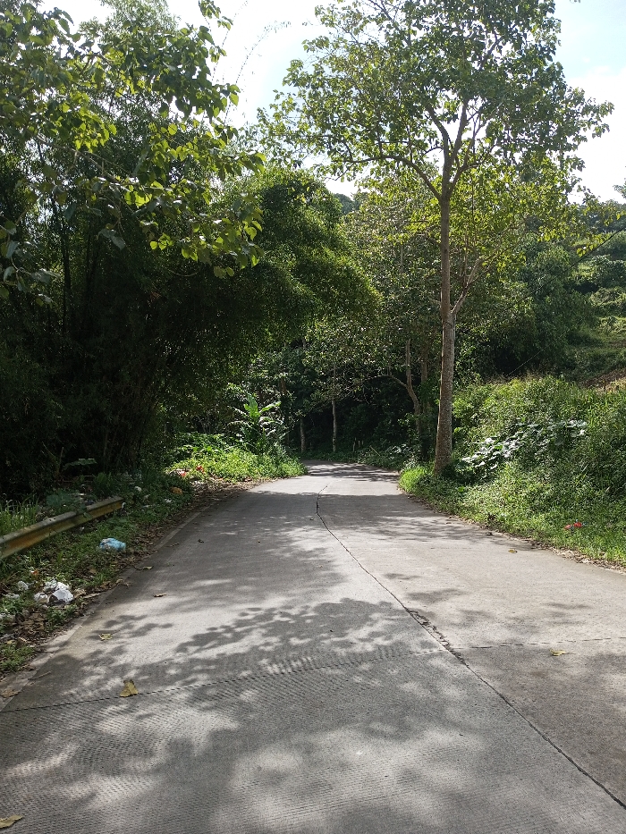 A paved road in Ariyalai, Sri Lanka, extends into the distance, curving slightly to the left. The road surface is concrete or asphalt, exhibiting a prominent longitudinal crack. Shadows of overhead foliage are cast across the road surface, indicating direct sunlight from above and to the right. To the left, a dense growth of bamboo and broad-leafed trees lines the roadside. A section of a yellow-orange metal guardrail is present along the left embankment, beneath which discarded litter, including white and blue plastic objects, is visible. To the right, a tall, slender tree with light-colored bark stands close to the road, its canopy of green leaves prominent. Further along the right side, dense green vegetation and additional trees rise from the roadside, suggesting an upward slope. The sky above is partially visible, showing clear blue with some white cloud cover. No individuals or active subjects are present in the scene.