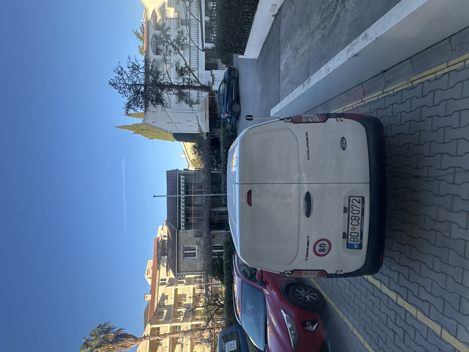 A white Ford Transit Courier van with license plate BO•CB 072 is parked on a paved area with yellow lines. To the left of the van is a red car and a blue object. Buildings are visible in the background, including apartment complexes with balconies and a house with a stone facade and a balcony with decorative ironwork. The sky is clear and blue.