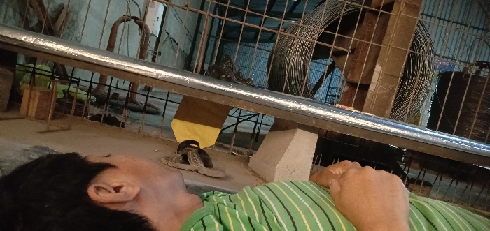 An overhead-angle image depicts a male individual lying supine on a concrete floor in Sumput, Indonesia. The subject's right profile, including the ear and dark hair, is visible in the lower-left foreground, slightly out of focus. His torso, clad in a green and white striped shirt, extends into the lower-right foreground. A horizontal, silver-colored metal bar, approximately 5-7 cm in diameter, spans the midground diagonally from left-center to upper-right. Resting on this bar, slightly right of center, is a dark-feathered bird, possibly a pigeon. Beneath the bar, to the right, is a light-colored, angled concrete block. A pair of worn, dark-colored sandals rests on the floor to the left of the concrete block. In the background, behind the metal bar, is a dark, open-grid metal fence or cage. Within this enclosure, a large spool of dark-colored wire is prominently visible. The overall environment appears to be an industrial or storage facility, characterized by metal structures and a concrete floor.