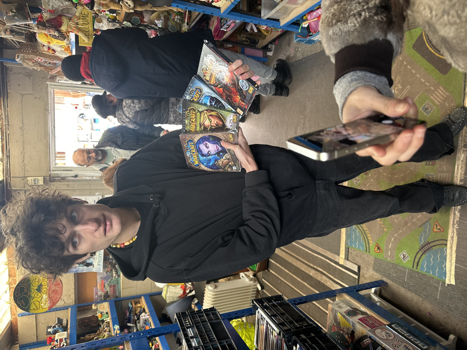 The image depicts the interior of a second-hand goods store or market stall located in Neuilly-Plaisance, France. A young male, estimated to be in his late teens or early twenties, with dark, curly hair, a pale complexion, and a neutral expression, stands centrally, facing slightly to his left (viewer's right). He is wearing a black hooded sweatshirt, dark jeans, and dark shoes with studs. A multi-colored beaded necklace is visible around his neck. He holds four "World of Warcraft" PC game boxes fanned out in his hands, presenting them towards the camera. The titles visible are "World of Warcraft" (original), "World of Warcraft: The Burning Crusade," "World of Warcraft: Wrath of the Lich King," and "World of Warcraft: Cataclysm." In the immediate foreground, to the bottom right, a right hand holds a silver-colored smartphone vertically, pointing it towards the young man, indicating a photograph is being taken. The person holding the phone is wearing a grey long-sleeved garment under a dark, possibly faux-fur-lined, outer layer. The background reveals an open doorway leading to what appears to be an outdoor area or another section of the market. Several individuals are visible in the background: a man with a bald head and grey beard, wearing a light jacket, stands just inside the doorway looking towards the camera; another person, mostly obscured, is behind him; and two more individuals, one in a dark hat and jacket with their back to the camera, are further to the right. The store environment is densely packed with merchandise. On the left, a blue metal shelving unit contains items like black plastic crates, possibly holding media, and a white radiator is positioned below. On the right, another blue metal shelving unit is heavily laden with various items, including numerous stuffed animals, decorative objects, and a "WELCOME" sign. The floor features a striped beige and brown rug partially covering a colorful children's playmat depicting roads and a river. The ceiling is rough, exposing brickwork or concrete, with visible pipes and wiring, characteristic of an informal retail space.