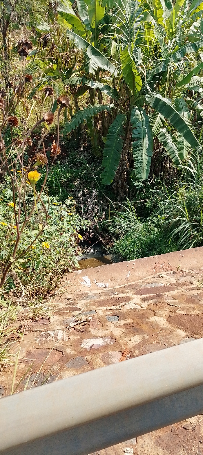 The image depicts a rural or semi-rural outdoor environment, identified as South Kasipul ward, Kenya. In the immediate foreground, a light-colored, horizontal guardrail or pipe structure runs along the bottom. Above this, a rough, reddish-brown surface, appearing to be degraded pavement or compacted earth with embedded stones and lighter patches of debris, extends across the lower portion of the frame. Beyond this surface, a narrow, shallow stream of brownish water flows from left to right, visible near the center. To the left of the stream, dense vegetation is present, characterized by dry, light brown stalks of plants with withered, spherical seed heads, and some smaller, vibrant green foliage containing scattered bright yellow flowers. To the right and directly behind the stream, a dense growth of tall, green grasses and broad-leafed plants is visible. The background is dominated by large banana plants with prominent green leaves, suggesting a lush, tropical or subtropical environment. Additional indistinct green and dry brown foliage fills the far background, indicating an overgrown area. No individuals, animals, or observable actions or interactions are present within the scene. The lighting suggests a bright, sunny day.