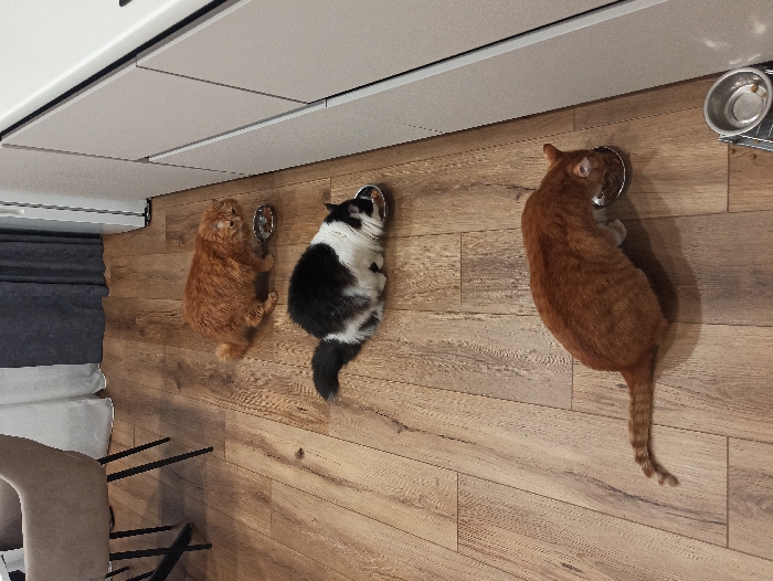 The scene is an indoor domestic environment, reportedly located in Кондратово, Russia. Three domestic felines are arranged in a diagonal line from foreground to background, each actively consuming food from individual silver metal bowls placed on a light brown wooden plank floor. In the immediate foreground, an orange tabby cat is positioned with its head immersed in a silver metal bowl, appearing to eat. Its striped tail extends leftward on the wooden floor. Slightly to the right and further back, a fourth empty silver metal bowl resting on a small metal stand is partially visible. Centrally in the image, a black and white long-haired cat is crouched low, also eating from a separate silver metal bowl. Further into the background, a third, medium-orange, fluffy tabby cat is similarly engaged, with its head in another silver metal bowl. The right side of the image displays a section of light grey kitchen cabinetry featuring minimalist integrated handles, extending into the background. The far left background reveals a portion of a beige upholstered chair with black metal legs, positioned in front of a window adorned with both white sheer and dark grey solid curtains.