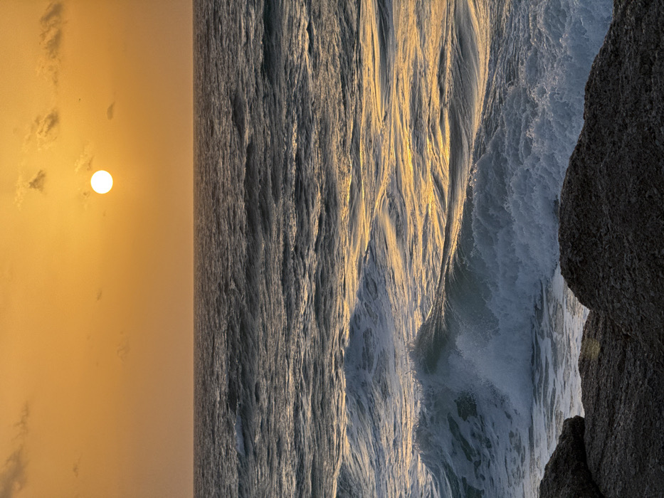 A vertical split showcases contrasting scenes. The left side features a hazy golden sky with a radiant sun. Scattered clouds are present. The right side displays a rough seascape with textured waves crashing against dark, rocky formations. Sunlight reflects on the water's surface, creating bright patterns. The division is stark, emphasizing the different elements of sky, sea, and land.