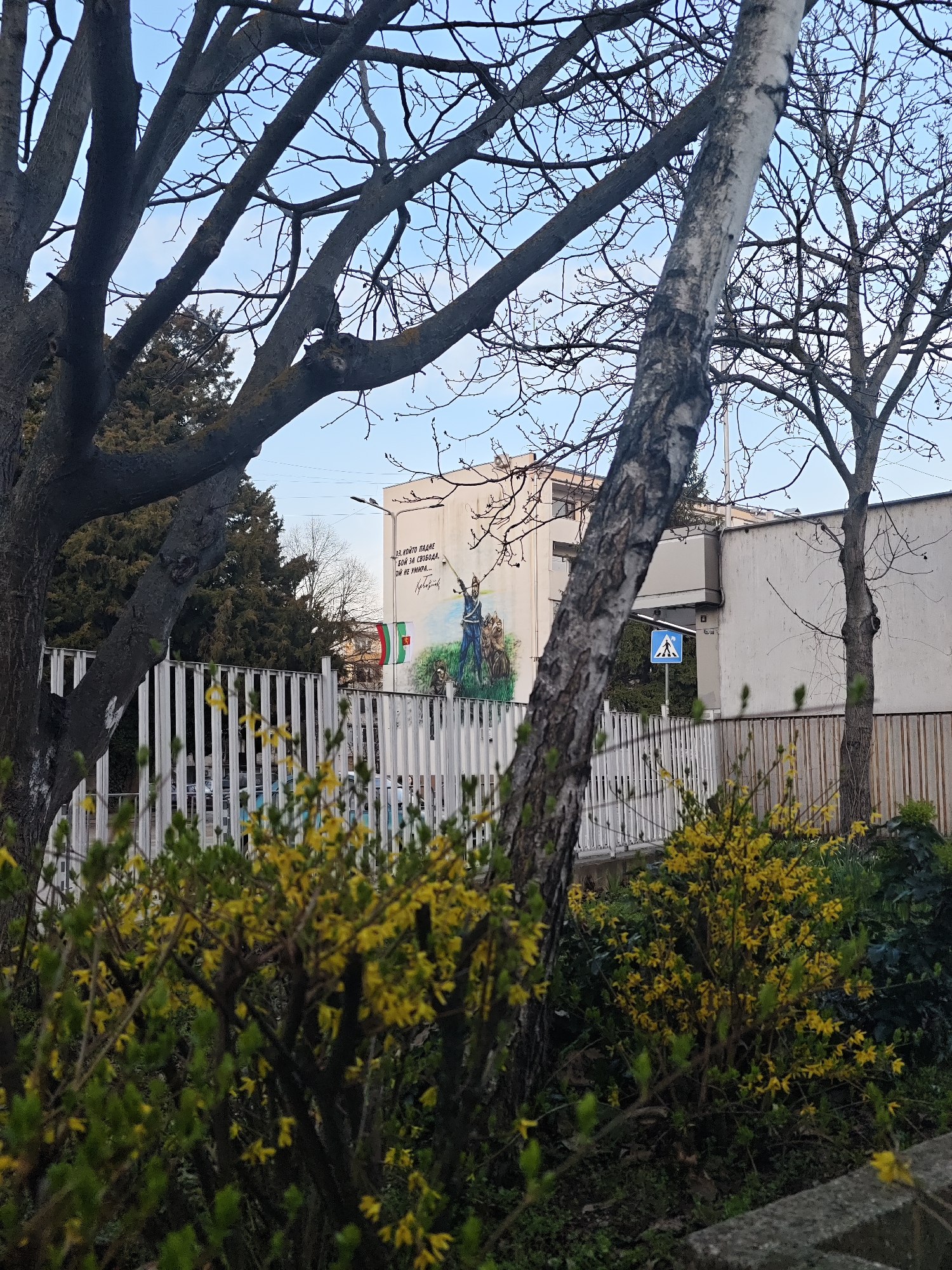 The image captures a scene in Kozloduy, Bulgaria, presenting a mural on the side of a building that is partially obscured by trees. The mural depicts historical figures and a Bulgarian flag, with text visible above. In the foreground, there are trees with bare branches, a birch tree, and yellow flowering bushes. A white picket fence runs in front of the building. A pedestrian crossing sign is partially visible behind the fence. The sky is a pale blue with scattered clouds.