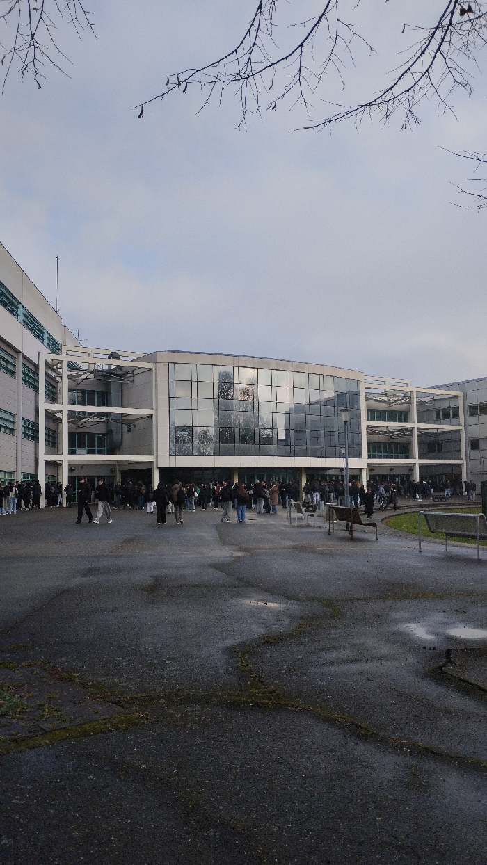 The image presents an exterior view of a large, modern institutional building located in Bischheim, France, under an overcast, light gray sky. Bare tree branches, some with visible pods, are silhouetted against the sky in the upper frame. The building's left section features a multi-story structure with light-colored paneling and horizontal, green-tinted window bands. A lightning rod projects from its roofline. The central facade is a prominent two-story glass structure comprised of numerous rectangular panels, reflecting elements of the sky and surrounding trees. This glass section is supported by a white, multi-level structural framework. Directly in front of the central entrances, a substantial gathering of numerous individuals, predominantly young adults or teenagers, is observed. They are primarily dressed in dark, cold-weather attire, including jackets and coats, with many carrying backpacks. Individuals are standing in groups, appearing to converse, while others are in transit across the paved area. One person in the mid-ground, left of center, is walking away from the building carrying a grey object, and another nearby holds a skateboard. The immediate foreground is a dark, paved surface, likely asphalt, showing visible cracks filled with moss or weeds, and multiple damp patches or small puddles. A curved, grassy strip with several dark-colored benches and a single dark lamppost lies between the paved area and the building's entrance. Additional benches are visible on the right edge of the paved section.