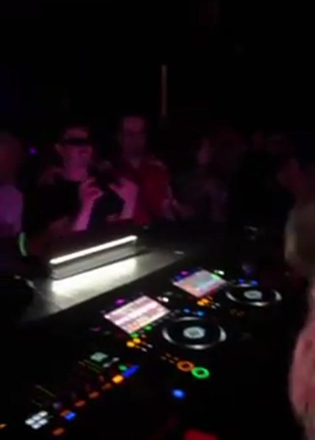DJ performing in a nightclub with an audience in front of them. The DJ is using a professional mixing board with two screens and various knobs and buttons. The DJ is wearing colorful clothing and appears to be enjoying the performance. The audience is diverse, with people of different races and genders. Some are dancing and raising their hands in the air, while others are standing and watching the DJ. The nightclub has dark lighting, with some spotlights illuminating the DJ and audience.