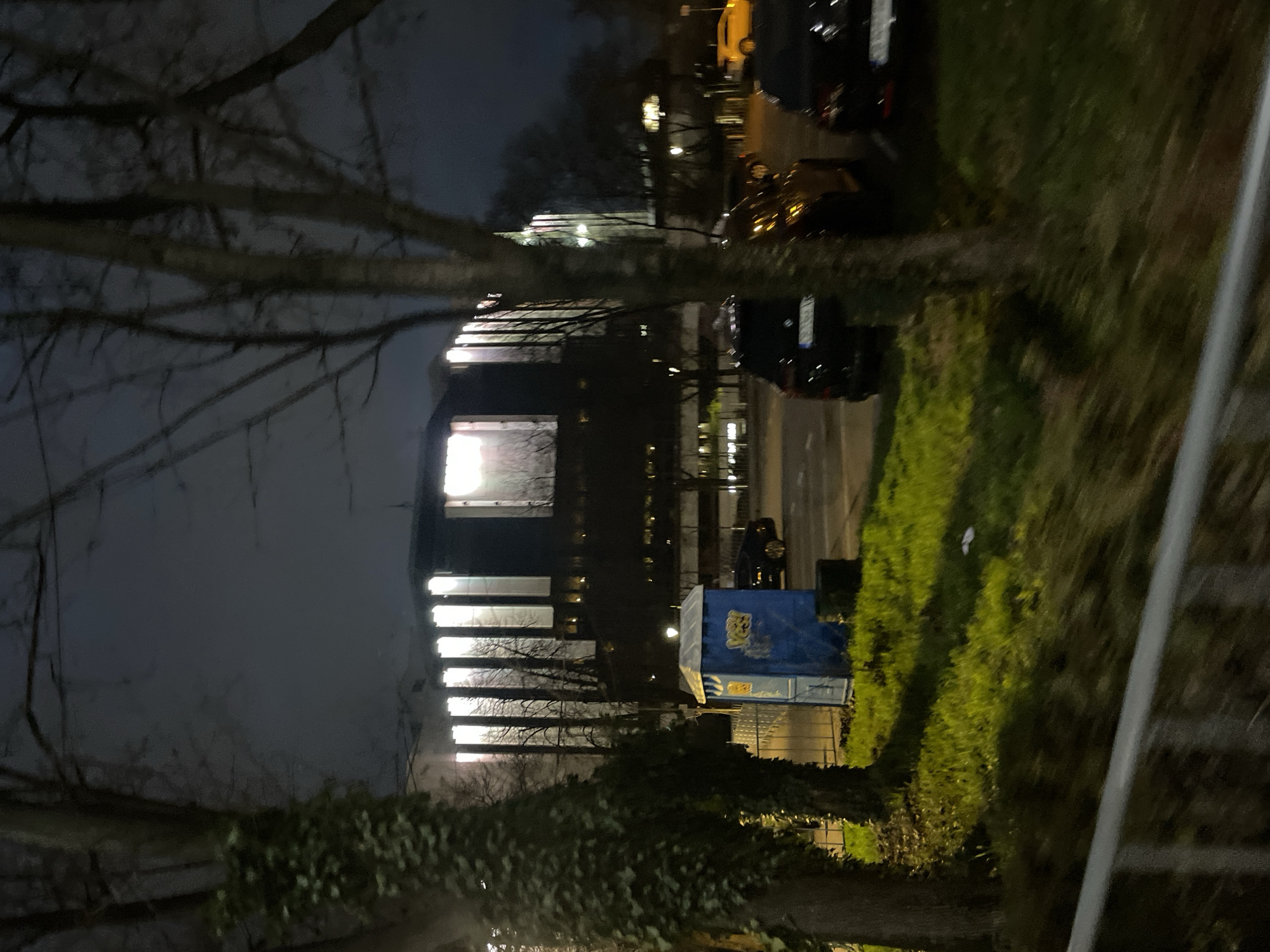 nighttime scene in Sofia, Bulgaria. In the middle ground, there's a modern office building with multiple illuminated floors. To the right of the building, there's a blue portable toilet standing on the grass. Several parked cars are visible further to the right along the street. The foreground is obscured by trees, some with ivy. The overall environment is urban and dimly lit.
