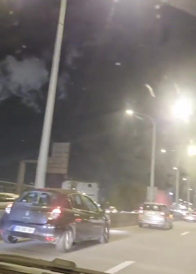 This video depicts a nighttime car ride through a city, as viewed from the dashboard of a vehicle. The driver appears to be on a multi-lane road with other cars in front. Streetlights are illuminated along the roadside. In the distance, several high-rise buildings are visible, their facades illuminated with numerous lights. The windshield of the car has some smudges or water spots. At the beginning of the video, what appears to be smoke is visible on the left side of the road.