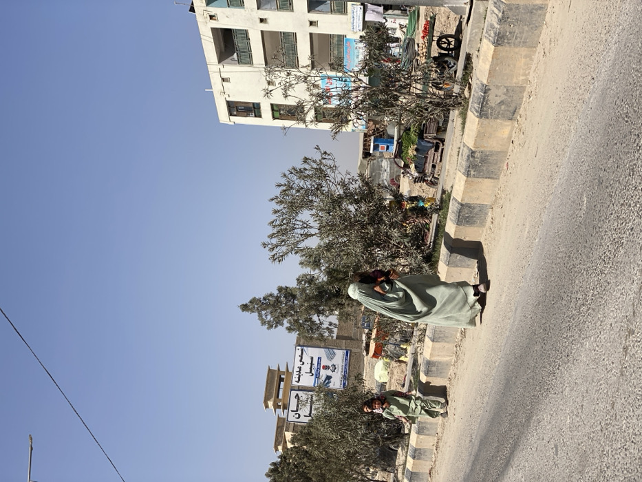 A woman wearing a long, light green garment walks along a sunlit street. To the right, a paved road with a concrete curb runs alongside her. Buildings are partially visible in the background, along with trees and signage. The sky is a clear, pale blue. Another person in green attire stands further down the street. The photograph is taken at an angle.