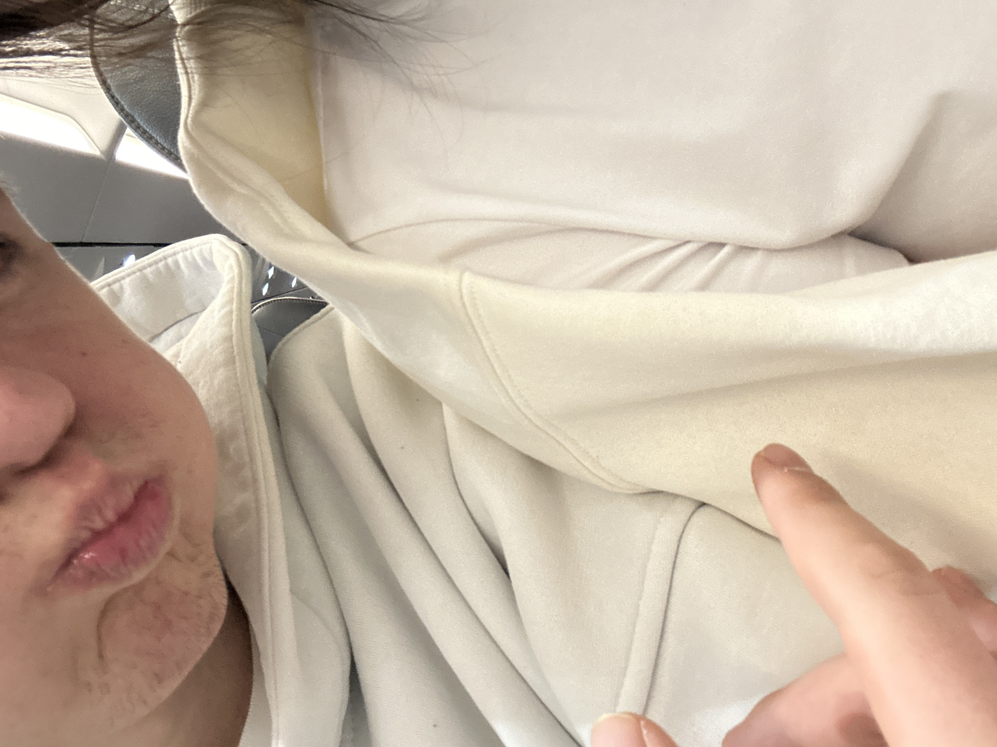 The image displays a close-up, angled view of two individuals in an interior setting. The upper left portion reveals the lower half of an individual's face, including slightly parted, hydrated pink lips, a chin, and the lower cheek area. Fine, light facial hair is visible on the chin and surrounding areas, alongside minor skin texture. This individual wears a light-colored, possibly cream or off-white, hooded garment. To the right, the upper body and shoulder of a second individual are visible, wearing a cream or off-white hooded sweatshirt over a white t-shirt. Long, dark hair extends over the right shoulder. In the lower left, an extended human index finger, appearing to belong to one of the individuals, is directed towards the fabric of the clothing. The background is significantly blurred, indicating an indoor environment with elements such as a dark grey seat back and linear light sources, potentially consistent with a vehicle interior. The specific location within the city of Spata-Loutsa Municipal Unit, Greece, cannot be determined from the visual information provided.