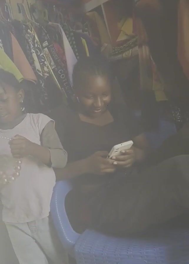 Here's a detailed description of the video: The video shows two young black women in what appears to be a cluttered room, possibly a closet or storage area. A younger girl is standing on the left, holding a string of large, pale pink beads. She is wearing a light-colored shirt and jeans. To the right of her, an older woman sits on a blue plastic chair, looking at and interacting with a white smartphone. She wears a black shirt and pants. Her hair is styled in braids. In the background, a rack of clothing is visible, with a variety of garments hanging on it. Above the clothing rack is a shelf cluttered with various items. The room is somewhat dimly lit, and the video quality is somewhat hazy. The older woman is smiling and focused on her phone, while the younger girl is holding the beads in her hands. The lighting is such that it's difficult to discern finer details within the room and on their faces.