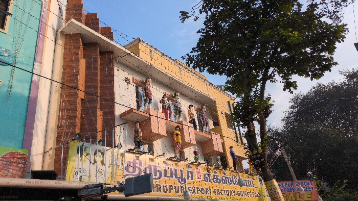 An eye-catching building features mannequins displayed on ledges along its façade. Signage in a foreign script is visible. A tree partially obscures the building, and utility lines crisscross overhead. The architecture includes both turquoise and brown accents, contrasting with the building's yellow upper portion. The scene suggests an urban commercial district.