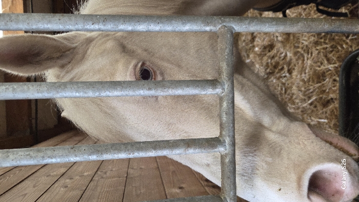 - "A light-colored horse, exhibiting a pale cream or off-white coat and a dark eye, is visible through the vertical galvanized metal bars of a stall" by FM-sTzIG3, licensed under CC BY 4.0