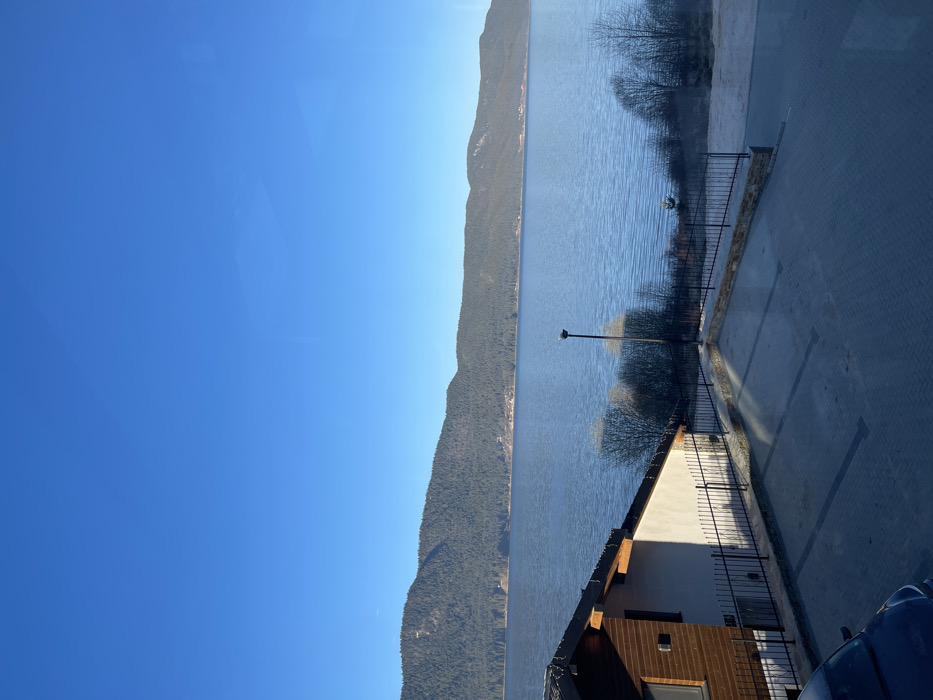The scene depicts a panoramic outdoor view of the Dospat Reservoir in Sarnitsa, Bulgaria, under a clear, cloudless blue sky. The expansive body of water, exhibiting a deep blue hue with surface ripples, dominates the mid-ground. It is bordered by densely forested mountains, primarily covered in dark green coniferous trees, along the distant shoreline. Sparse settlements are discernible along the far mountainous shore. In the foreground, a paved parking area constructed from interlocking grey pavers with white demarcation lines is visible. Sunlight casts distinct shadows across portions of this pavement. A dark-colored vehicle, likely a car, is partially visible in the bottom left corner, parked on the paved surface. To the left, a two-story building with a gabled roof, dark tiles, brown wooden siding on the upper level, and light-colored stucco on the lower level is partially framed. Small, white string lights are visible along its roofline. A black metal picket fence, supported by a stone retaining wall, separates the paved area from the immediate shoreline, which features bare deciduous trees and low vegetation. A single, tall, dark-colored lamppost stands between the parking area and the reservoir. No individuals are present in the image.