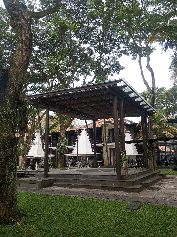 - "A shaded outdoor pavilion structure dominates the scene, constructed of dark wood posts and a transparent roof" by FM-LzJwz2, licensed under CC BY 4.0