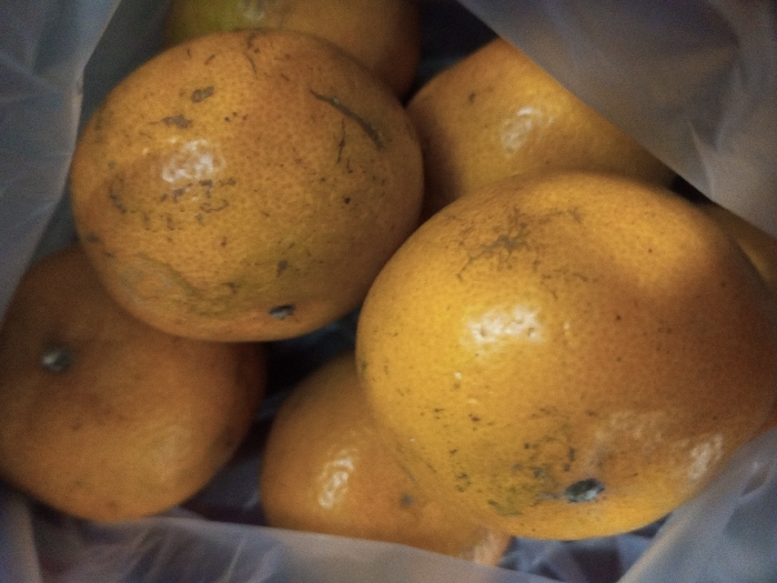 Several oranges are nestled together within a translucent plastic bag. Their skins exhibit a vibrant orange hue, marked by natural blemishes and dark spots. The oranges fill the frame, appearing plump and juicy, suggestive of their potential flavor and freshness. The plastic bag partially obscures the view, contributing to the overall sense of a contained group of fruits.