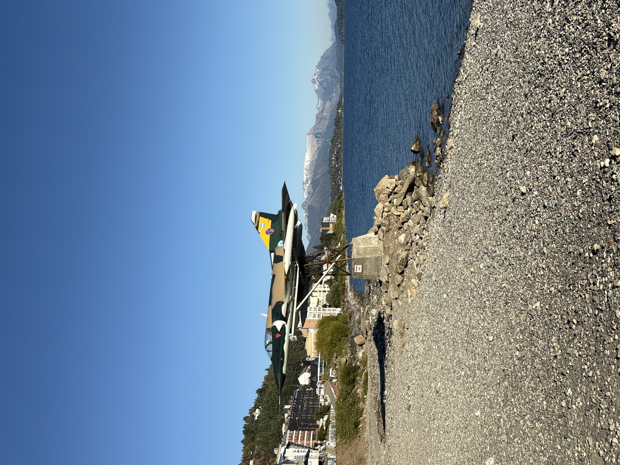 The image captures a static scene on the pebble shoreline of Lake Nahuel Huapi in San Carlos de Bariloche, Argentina, under a clear blue sky. A camouflaged Dassault Mirage III/V fighter jet, featuring green, brown, and tan paint, is centrally positioned as a monument. The aircraft, bearing Argentinian Air Force insignia and the fuselage marking "I-04," is mounted on an angled brown metal framework secured to a grey concrete base. A small rectangular sign, red and white, is attached to the concrete base. The foreground consists of a wide, light grey-brown pebble beach that transitions into the dark blue, calm waters of Lake Nahuel Huapi. Along the left mid-ground, a section of San Carlos de Bariloche is visible, characterized by multiple multi-story buildings nestled into a vegetated hillside. In the distant background, beyond the lake, a range of snow-capped mountains, part of the Andes, extends horizontally across the horizon. The scene is illuminated by strong sunlight, casting visible shadows from the monument onto the beach. No people are present, and no actions or interactions are depicted.