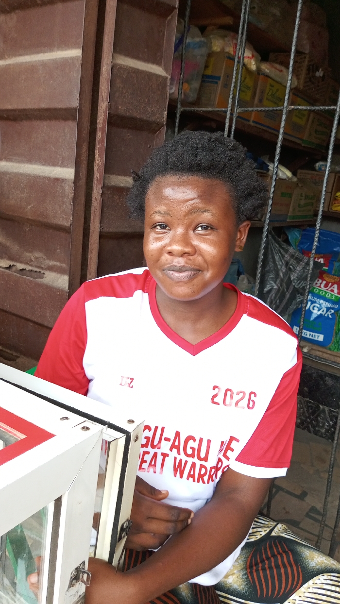 A dark-skinned female, estimated to be in her twenties, is depicted seated, looking directly at the viewer with a slight smile. She has short, curly dark hair. Her attire consists of a white t-shirt featuring red shoulder and collar accents. The shirt bears a "DZ" logo on the left chest, the numeral "2026" on the right chest, and partially visible red text across the lower torso that reads "GU-AGU VE GREAT WARRIOR". Her hands rest on or near a white and red-framed display case in the lower left foreground. The scene is set in a commercial environment, consistent with a small shop or street stall in Onitsha, Nigeria. To the subject's left, a dark, corrugated metal structure is visible. To her right, behind metal security bars, shelves are densely stocked with various retail products, including cardboard boxes and a prominent blue bag labeled "BUA FOODS SUGAR". Other discernible product markings include "Deluxe" and "Royal 5 KGS".