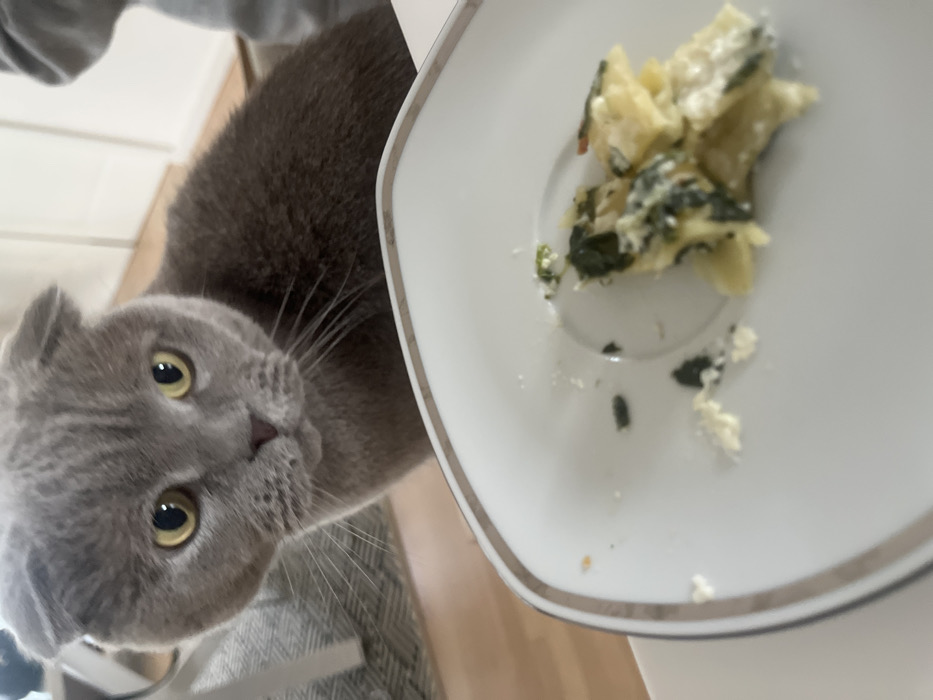 The scene depicts an indoor domestic environment in Strasbourg, France. A grey Scottish Fold cat with characteristic folded ears and large, round yellow eyes is positioned in the mid-ground, observing a white, square-shaped ceramic plate in the foreground. The cat's head is slightly tilted, and its gaze is directed forward, appearing to focus on the plate. Its short, dense grey fur is visible from the chest upwards. The plate, adorned with a thin gold-colored rim, contains remnants of a meal consisting of light-colored pasta (possibly ravioli or tortellini) mixed with a creamy white sauce and dark green leafy vegetables, presumably spinach. Scattered white crumbs and small dark green fragments are visible on the plate, indicating partial consumption. In the blurred background, a light-colored furniture piece, possibly a chair leg, is partially visible on the left. To the right, a blurred human figure wearing a grey garment is faintly discernible behind the cat's body. The lighting suggests an interior setting with ambient illumination.