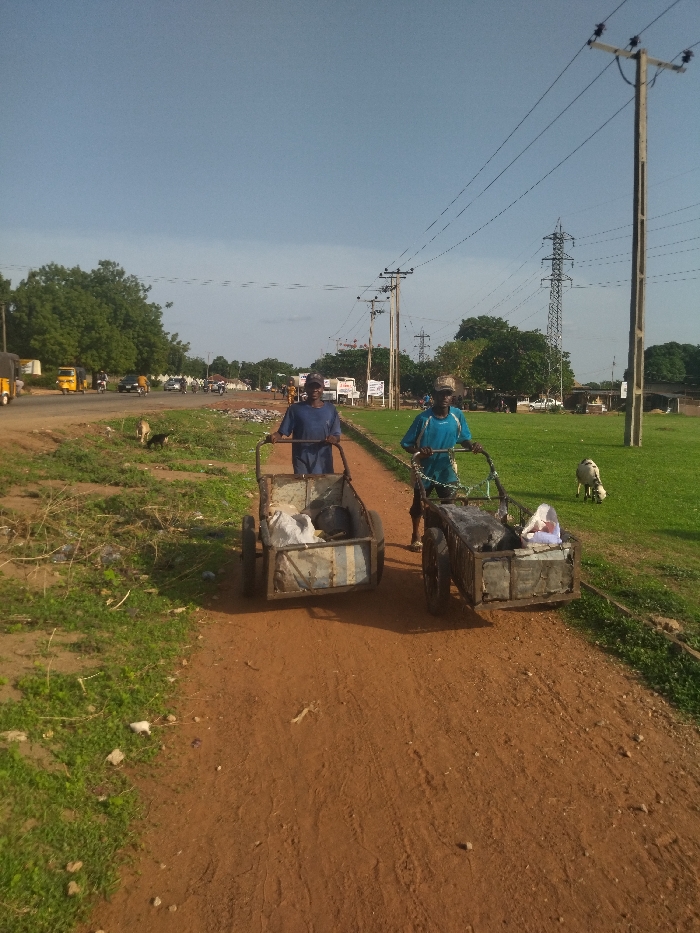 two men pushing handcarts filled with refuse along a dirt road in a rural area near the city of Kanshio, Nigeria